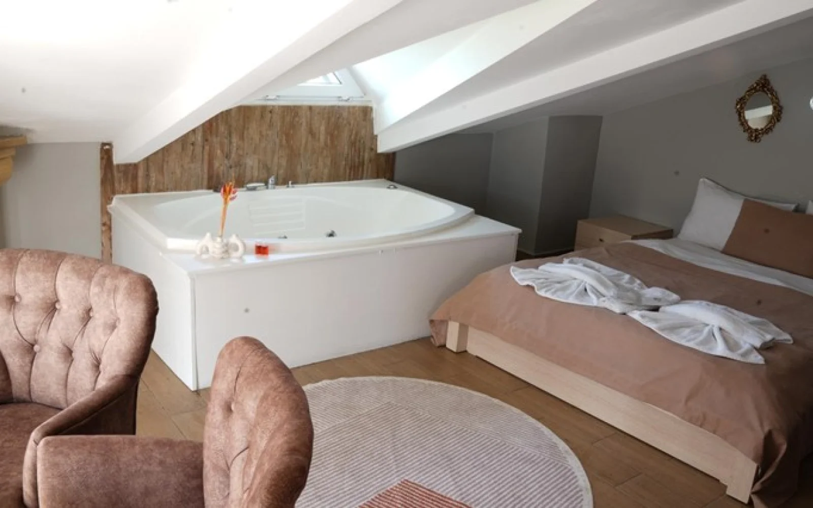 Modern şıklıkla dekore edilen odamızda; şömine, çift kişilik jakuzi, özel teras, split klima, TV, mini bar, oda servisi, kablosuz internet, banyo, küvet, saç kurutma makinesi ve daha fazlası sizi bekliyor. Her detay, sizin rahatınız için tasarlandı.